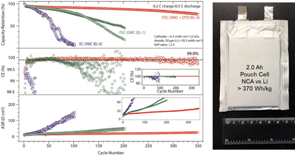 采用筛选出的1 M LiPF6 FEC-DMC + 3 wt% DTD电解液,具有高面积容量的高电压钴酸锂作为正极(~4.2 mAh/cm2),50 mm 厚度的锂金属作为负极,在扣式电池中已经实现350次稳定循环(80% 容量保持率,充/放电倍率为0.2/0.5 C),较高平均库伦效率、和较慢的电池内阻增长。在更为苛刻的、使用20 um厚的Li金属作为负极的条件下,全电池循环寿命仍然可达130圈。在合作单位组装的软包电池中,使用高面积容量的镍钴铝酸锂(NCA)作为正极,已可达到> 370 Wh/kg的单体电池能量密度和超过100次的循环寿命。另外,该项目前期形成的专利(US20170288281,WO Patent 2017176936)已经授权给美国24 M Technologies公司在半固态(浆料)电池中使用。