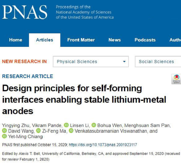 全文链接:Yingying Zhu, Vikram Pande, Linsen Li,* Bohua Wen, Menghsuan Sam Pan, David Wang, Zi-Feng Ma, Venkatasubramanian Viswanathan,* and Yet-Ming Chiang,* Design Principles for Self-forming Interfaces Enabling Stable Lithium Metal Anodes, Proc. Natl. Am. Sci. 2020, https://doi.org/10.1073/pnas.2001923117