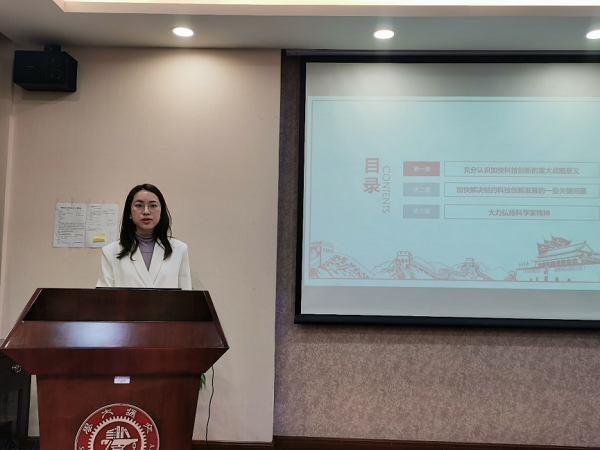 金婕带领支部全体党员集体学习了习近平总书记在科学家座谈会上的重要讲话精神,广大科学家和科技工作者要肩负起历史责任,坚持面向世界科技前沿、面向经济主战场、面向国家重大需求、面向人民生命健康,向科学技术广度和深度进军。随后,她讲述了化学化工学院杰出校友徐光宪院士、博士生导师张万斌教授以及博士毕业生何睿学长的故事,号召支部成员应当追随前辈师长的足迹,学习和发扬科学家精神,把自己的科学追求融入建设社会主义现代化国家的伟大事业中去。