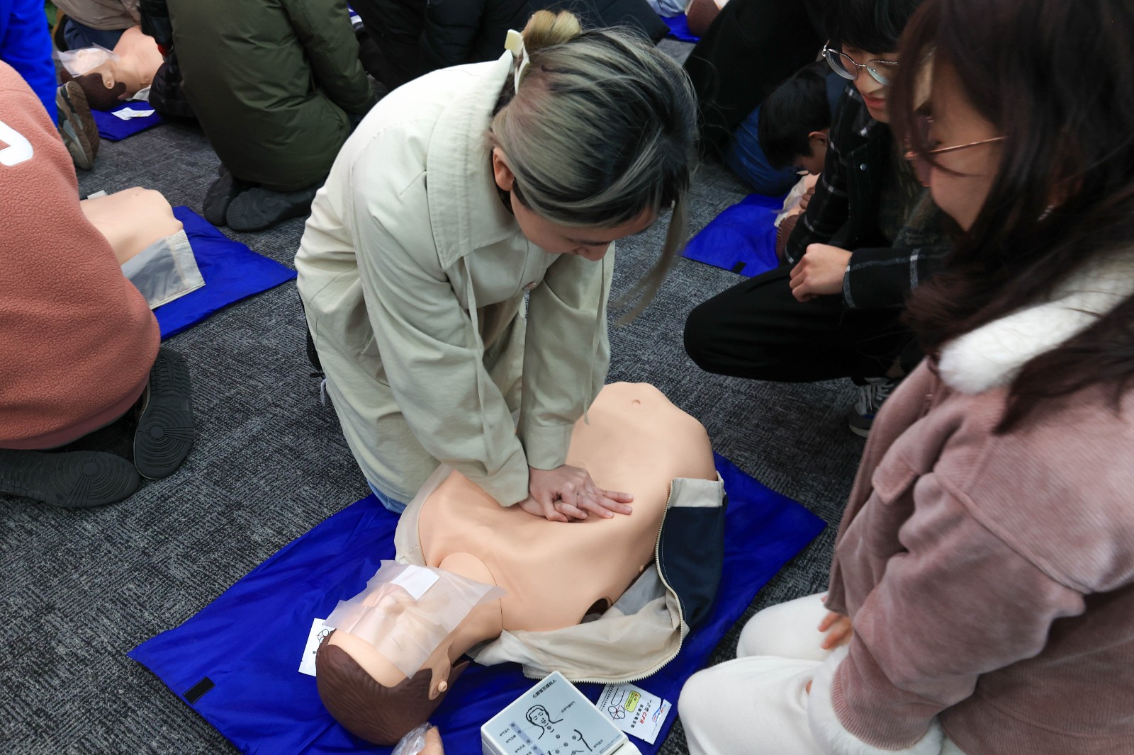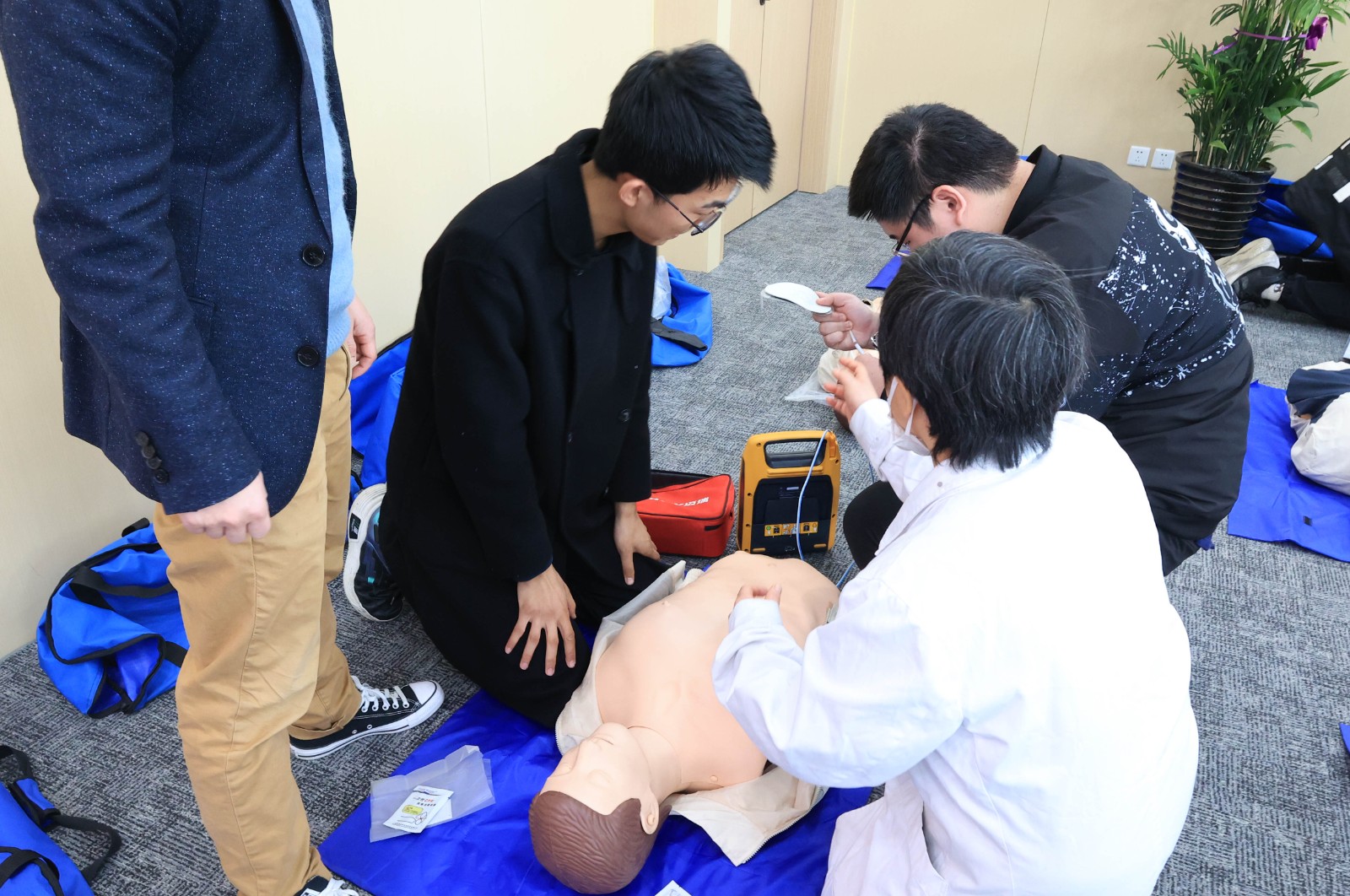 在现场准备了30套仿真人模、AED除颤仪等道具,各位师生在刘院长、黄医生、林医生的演示和指导下,认真学习了救援手法与规则,同时在仿真人模上演练了胸外按压、AED除颤等心肺复苏救护方法。