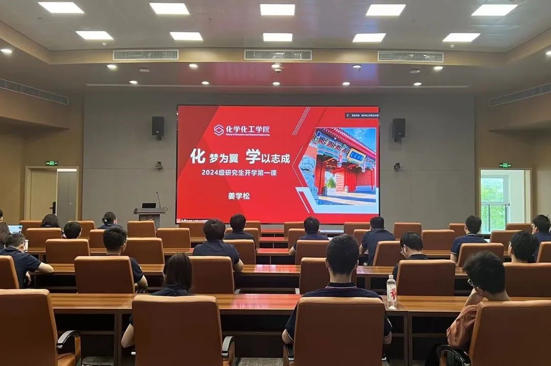 姜学松以《化梦为翼 学以致远》为题为研究生新生讲述了一堂生动而深刻的新生第一课。他首先代表学院对2024级研究生的到来表示欢迎。他从学院发展历史、师资力量、人才培养、科研成果等方面进行了详细介绍,同时也向大家阐述了化学这一学科对于人类发展、科技进步的重要性和影响力,鼓励同学们将个人梦想融入国家发展大局,以科学精神为翼,将所学知识转化为解决实际问题的能力,为实现中华民族伟大复兴的中国梦贡献青春力量。