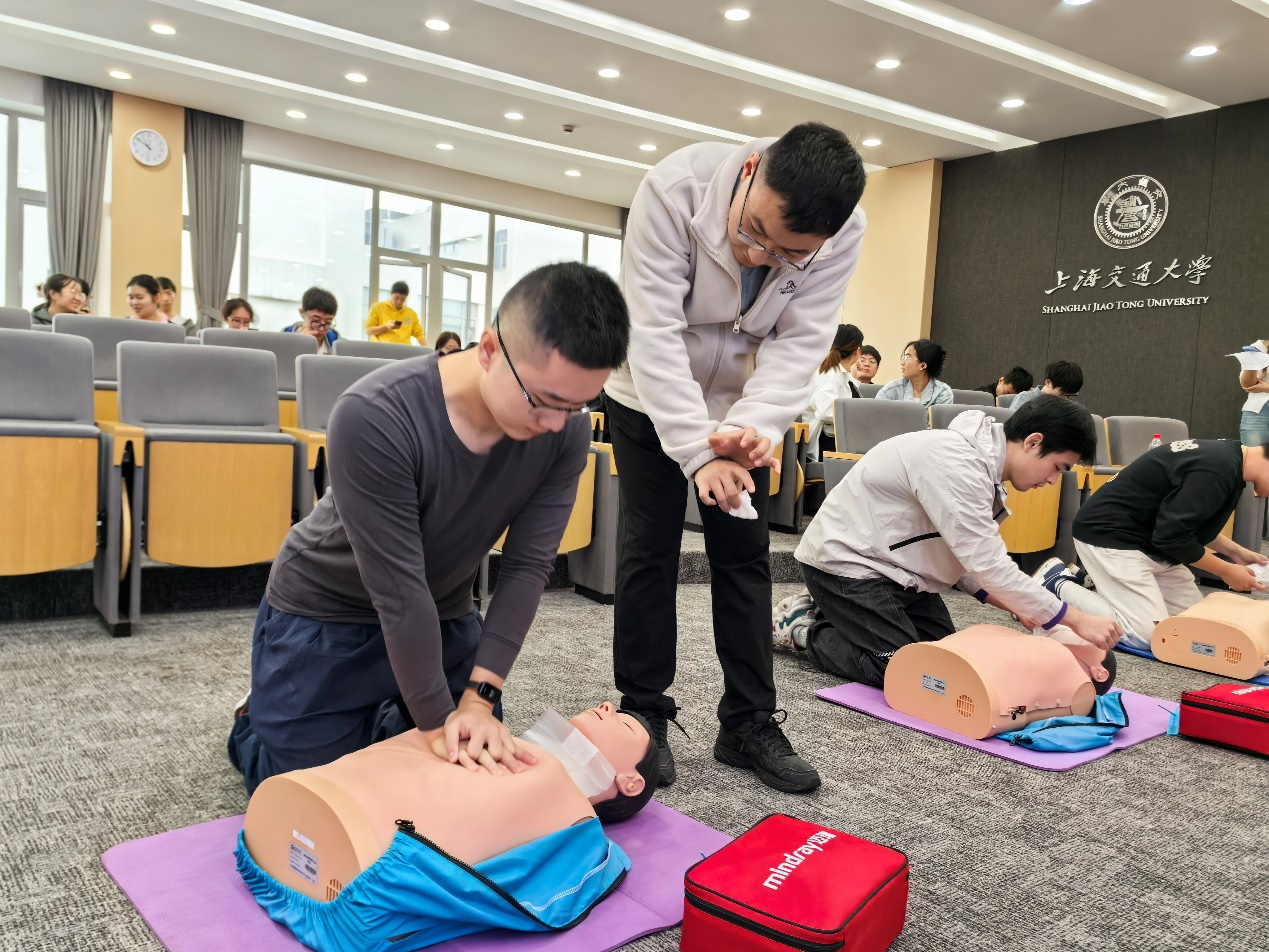 在理论讲解的基础上,四位急救师还带领同学们开展了实操训练。通过模拟成人心肺复苏和AED使用的场景,让每位同学都有机会上手操作,亲身体验急救技能的实际应用。同学们在急救师的指导下,认真练习,不断纠正自身动作。通过实操训练,同学们不仅掌握了急救技能,还提高了自己的应急反应能力。