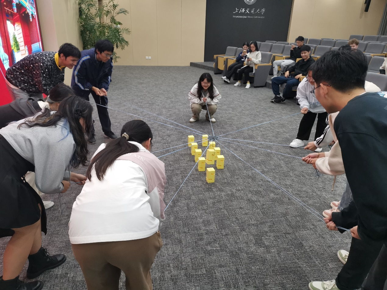 在 “合力建塔”活动中,团队需要共同完成塑料方块的搭叠,每一位同学都需要在过程中全心投入,关注好方块的位置与速度,要求小组成员之间相互信任、密切配合,共同完成挑战。