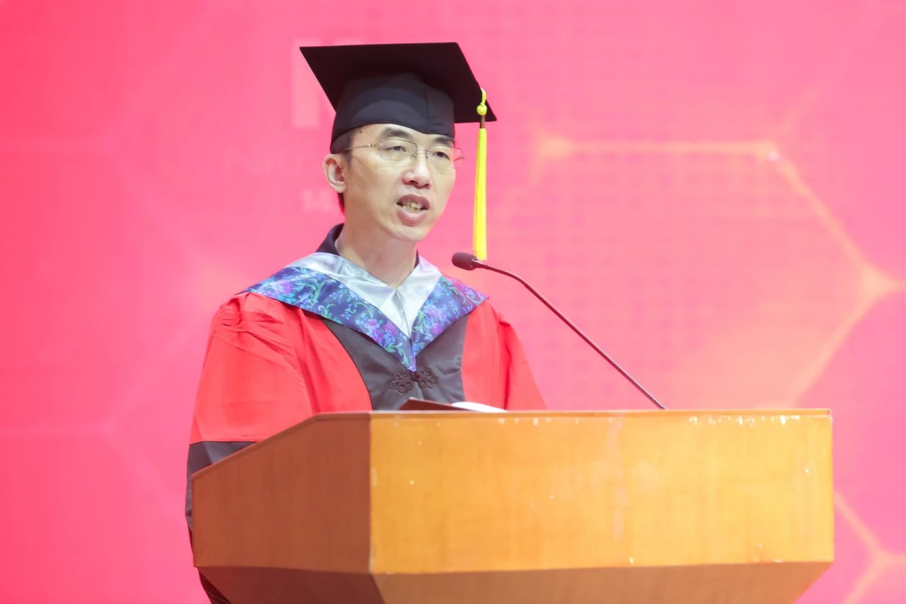 樊春海在致辞中代表学院向2025届全体毕业生致以衷心祝贺,向老师和家长致以诚挚感谢。他指出,2025届毕业生在求学期间展现了卓越的科研能力和创新精神,为学院发展注入了新的活力。面对即将开启人生新篇章的毕业生,樊春海寄语毕业生们坚持终身学习,持续提升专业素养和综合能力;坚持迎难而上,培养百折不挠的坚韧品格;坚持开拓创新,勇攀科技高峰;坚持家国情怀,将个人理想融入民族复兴伟业。最后,他勉励毕业生传承“霞光精神”,在新时代建功立业。