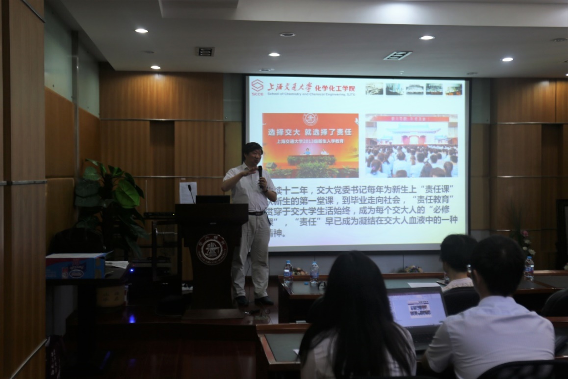 随后,贾金平书记为同学们作远航教育。他从校训“饮水思源,爱国荣校”出发,强调“选择了交大就选择了责任”;通过回顾化学化工学院的发展历史,强调只有不断创新,才能不断为祖国做贡献;通过自己十年的工会工作经历告诫大家在平时的工作中一定要务实。贾书记希望大家在毕业之后要保持梦想和激情,保持共产党员的本色,敢于随时亮出党员的身份,成为对社会有用的人。他鼓励大家在未来的学习工作中,要始终铭记自己交大人的使命和荣誉感,不为利益所驱动,向着自己的目标前行,实现自己的梦想。 接着,关工委张斌老师发言,她向同学们提出了三点建议。不要好高骛远,要脚踏实地;不要盲目考研,要量力而行;要增强心理承受力,勇敢面对未来。她祝愿大家要做对国家有用,对家庭有责,对他人有爱的人。 郑浩老师说,青年党员要树立“与祖国同向同行”的时代理想信念,“两学一做”,“学”是基础,“做”是关键,虽然走出校门,但大家依然代表着交大,依然要牢记自己的使命和对社会奉献的义务,实现自己的人生理想与价值!他要求大家眼中有方向,心中有信仰,浑身充满正能量。 最后,全体毕业生党员和预备党员在张嘉诚的带领下再次重温入党誓词,面对党旗,回忆初心,许下永远跟党走的庄严承诺。 撰稿:宋叶丰