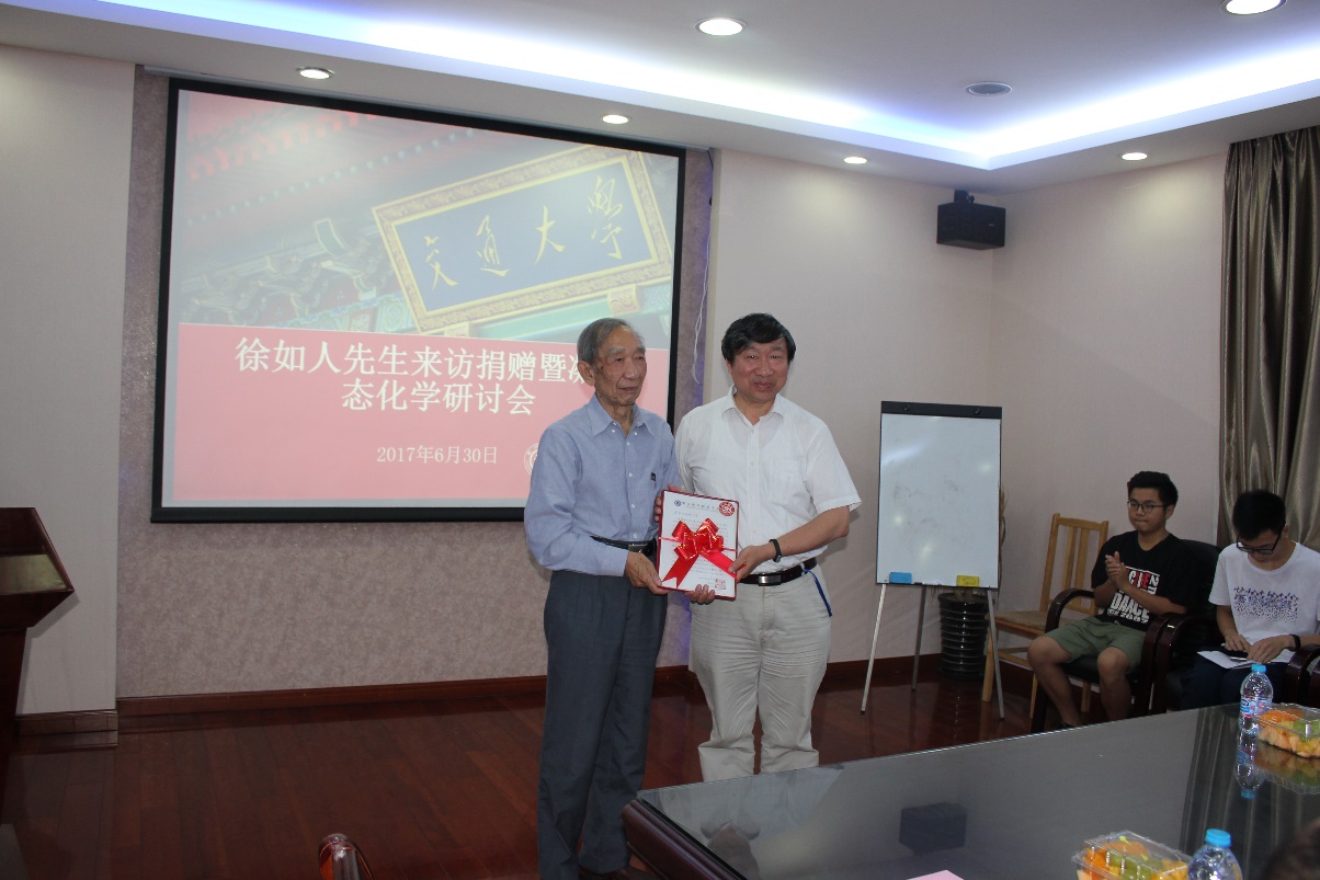 6月30日上午10点,受学院邀请,化工学院1952届杰出校友,中国科学院院士、吉林大学徐如人教授到访上海交通大学化学化工学院。徐院士他与顾翼东院士在科学研究方面的多次书信交流手稿捐赠给学校,并主持凝聚态化学研讨会。参加本次捐赠仪式与研讨会的有:吉林大学闫文付教授,学院党委书记贾金平,交大校友会办公室副主任桑大伟,交大档案馆业务指导室主任李弋,化工学院的化学化工专业的特聘教授,青年千人及学院研究生等50余人参加。本次捐赠仪式与研讨会由特聘教授陈接胜主持。