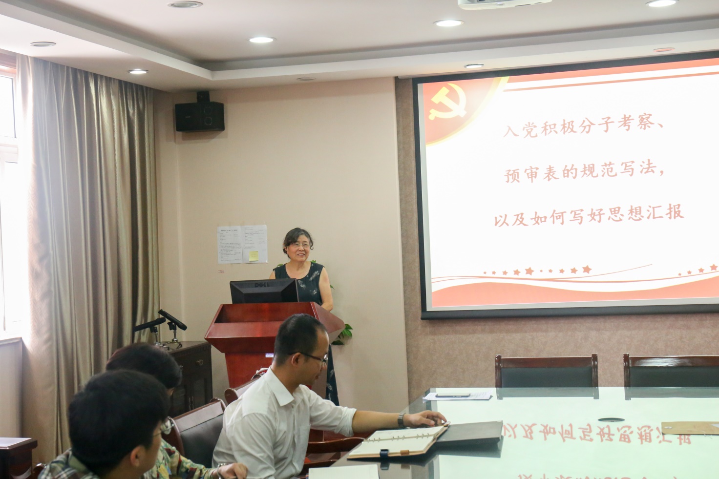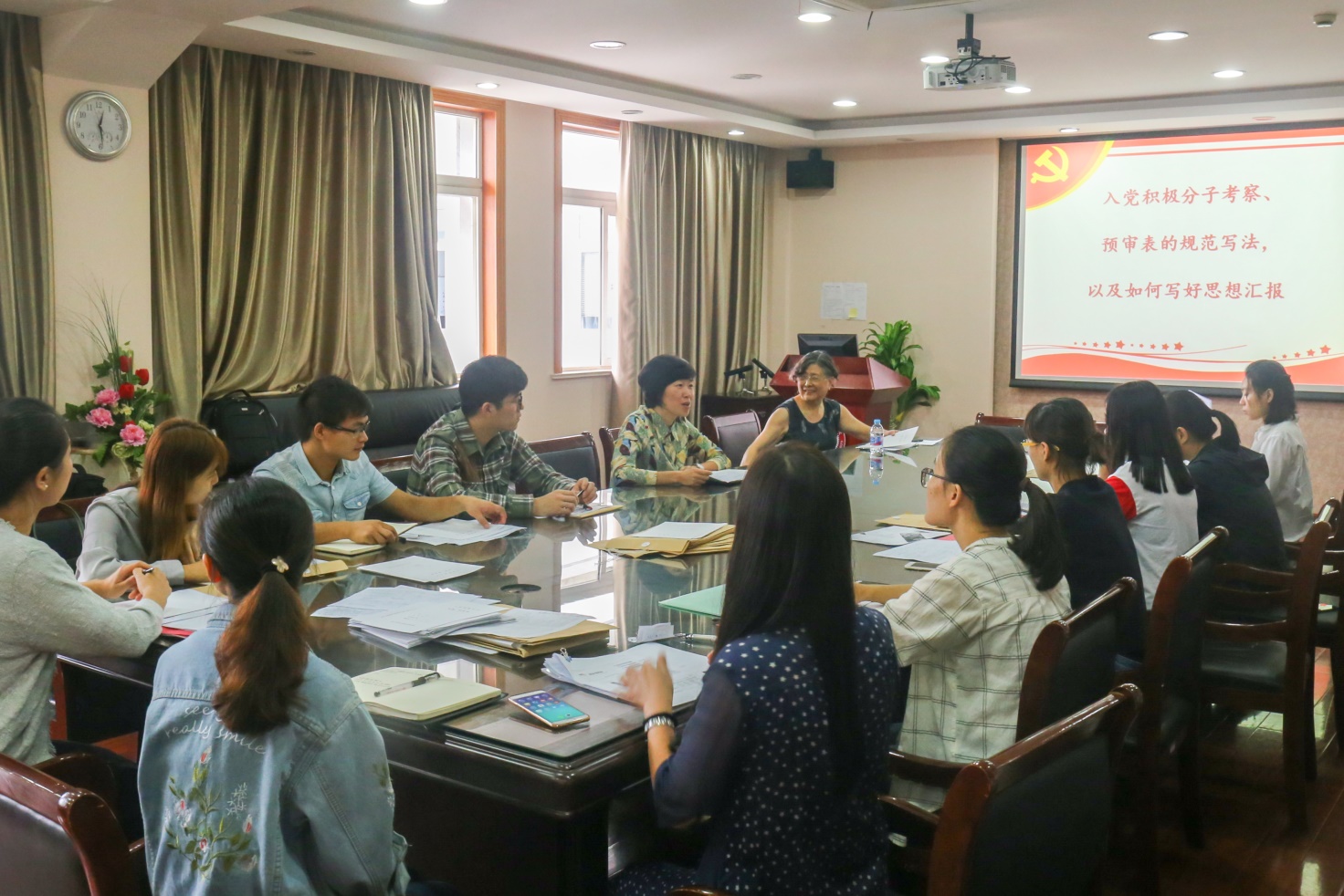 章瑛老师从入党积极分子考察表的规范写法和如何写好思想汇报两个方面对党支书进行了党务培训。在对每项填写内容进行详细说明的同时,她着重强调每一个联系人要实事求是做好对发展对象的考察和记录,这既是对发展对象负责,也是对党组织负责。 随后,李安英老师从严格党员发展标准和程序、健全党员考核机制、加强思想建设等方面进行了工作指导,并对新学期学生党建重点工作进行了布置。