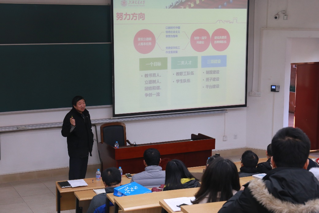 贾金平进行题为“立德树人,教书育人”学习贯彻十九大精神部署。贾金平首先对十九大报告中教育工作部署进行解读:把教育放在民生之首、立德树人是教育的根本任务、高等教育的发展、推进教育公平及加强师风师德建设等是报告中体现的要点工作,也是全院师生未来的努力方向。贾金平指出,过去一年学院立德树人、教书育人工作在全体教职工、全体学生的努力下收到了可喜的成效,在未来的工作中仍要坚持党的领导,扎实推进“两学一做”制度化、常态化,继续提升办学质量。最后,贾金平展望了学院未来工作的重心和方向,他指出,学院要秉承教书育人、立德树人、团结和谐、争创一流的目标,依托师生人才,完成制度、班子和平台三项建设。