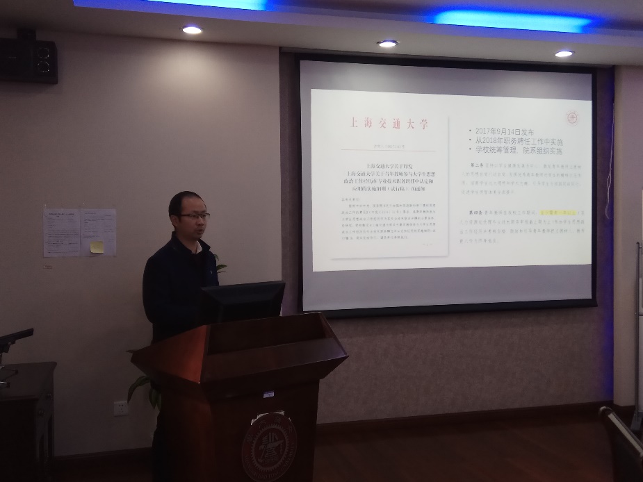 郑浩首先介绍了《细则》的相关规定:以学生健康发展为中心,激发青年教师立德树人,发挥优秀青年教师对学生的榜样示范作用,培育学生远大理想和学术志趣。《细则》指出,青年教师参加大学生思政工作的载体主要分为以下几类:担任本科生班主任、担任研究生班主任、担任本科生班导师、担任兼职思政教师、担任留学生辅导员、担任学生社团指导教师、担任学生莙政项目、担任挑战杯指导教师等。随后又介绍了化学化工学院的学生现状和岗位需求情况,同时介绍了化学化工学院参加莙政项目、挑战杯项目的情况,解读了目前施行的班主任工作条例。