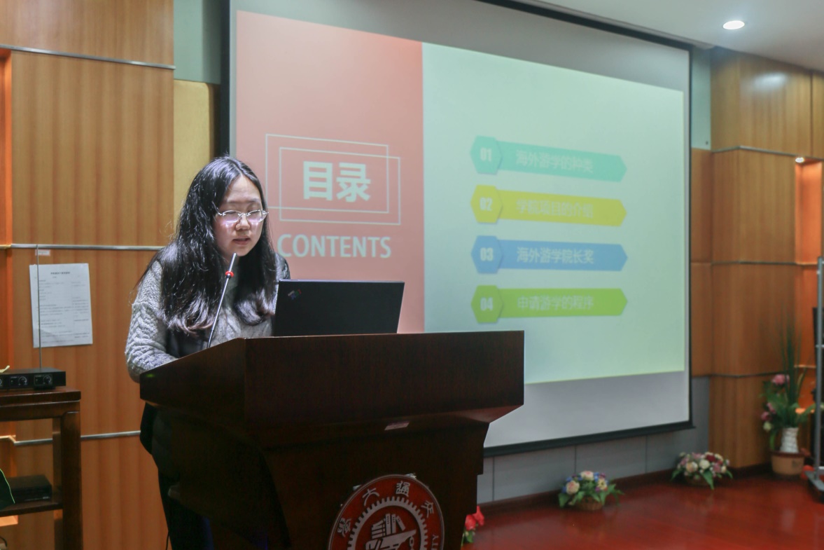 第一板块是出国研修交流。首先,胡筱可老师向同学们进行了海外游学信息的分享。胡老师不仅向同学们介绍了化学化工学院和学校的海外游学项目,还介绍了海外游学项目的申请流程。