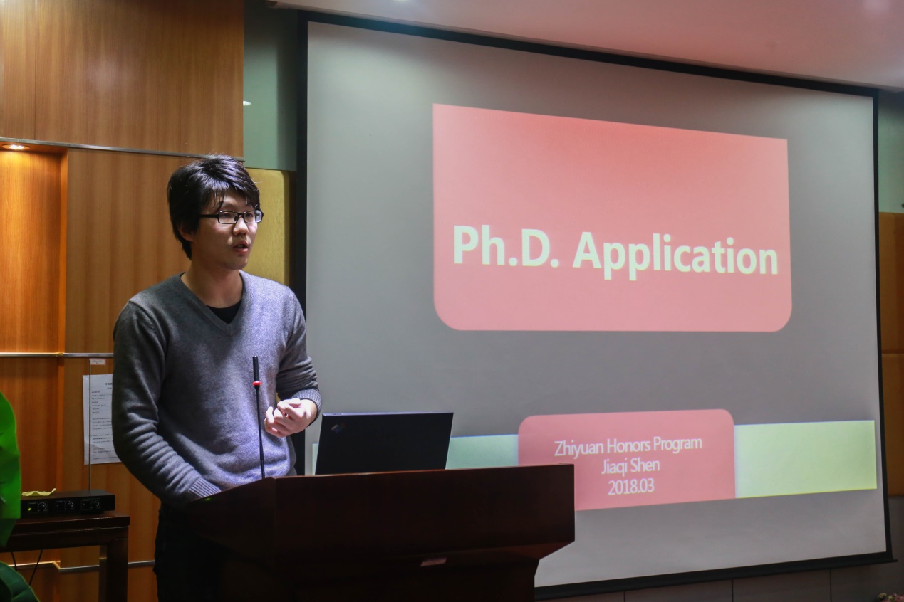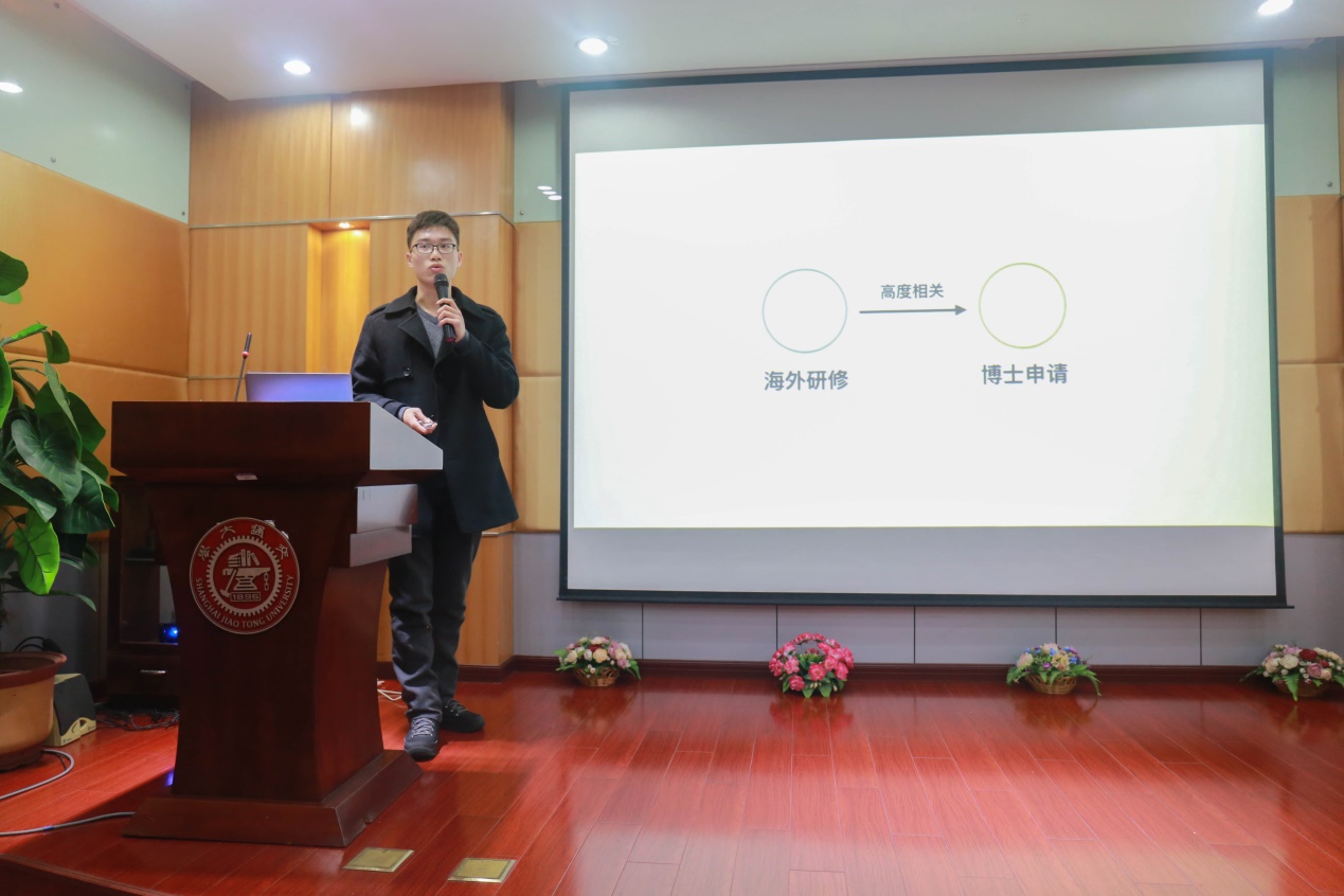 随后致远学院的沈佳琪和任之初同学分别向同学们介绍了美国高校PhD和海外研修的申请方法,包括申请条件,如何进行申请工作以及申请过程中的小技巧。化院博士生张嘉城也进行了经验分享,内容主要包括在英国的交流经验总结,温馨提示以及在海外交流中需要注意的问题等。