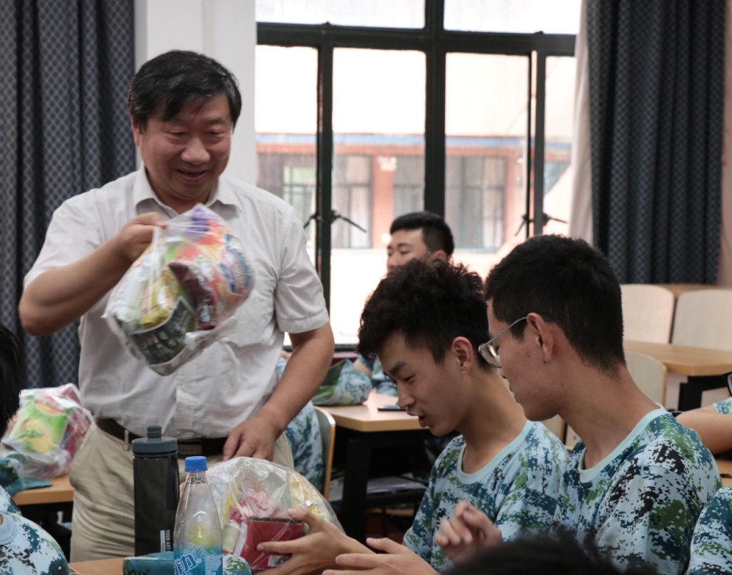 发言之后,贾金平书记、郑浩副书记为教官、同学们发放慰问品,将学院的关怀带给了刻苦训练的同学们。拿到慰问品的同学们喜上眉梢,有心急的同学马上打开享用了起来。