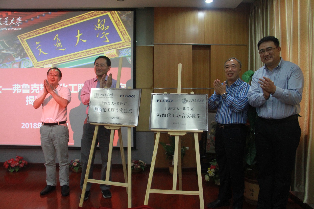 签署完毕后,朱新远院长、刘燕刚教授和周宏斌董事长、罗正鸿副院长共同为上海交大-弗鲁克精细化工联合实验室揭牌。 FLUKO成立于1999年,是国内较早进行混合技术应用方案研究的企业之一,19年来秉承德国先进的制造技术,持续创新,形成了完整的研发、设计、制造、营销及服务体系,致力于各种精细混合技术的解决方案。持续获得德国TÜV莱茵认证、欧盟CE认证、累计几十项设计专利。产品和服务遍及世界30多个国家和地区,在100+个领域中,向10000+家企业客户提供了安全、有效的产品方案和及时的技术支持。 撰稿:周 正