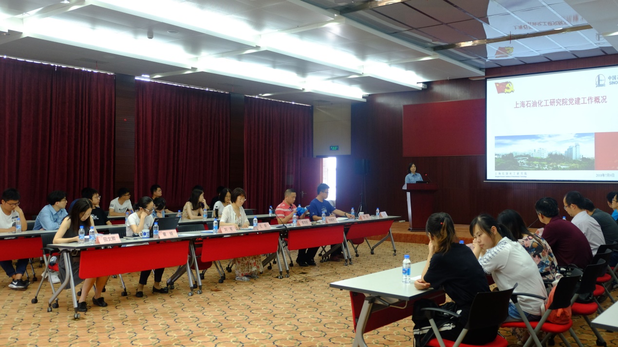 7月9日,化院研究生B1611093/4联合党支部成功开展了“共行计划”暑期社会实践活动,组织支部党员学生在学院党委副书记郑浩老师和“共行计划”实践团团长李蕊的带领下,乘坐大巴来到了中石化上海石油化工研究院学习参观交流。中石化上海石油化工研究院人力资源部副主任陆巍然、管理三党支部书记王聆、科技管理部副主任刘军、上海交通大学化学化工学院科研办主任孟庆华、组室党支部书记张青老师、学生党建负责老师李安英等参加了此次活动。王聆书记带领大家了解了中石化上海石油化工研究院自1960年建院以来的发展历程,老一辈的化工人为国家经济建设和石油石化产业发展做出了重要的贡献,奉献了自己的心血,展现出了极其优良的行业品质。