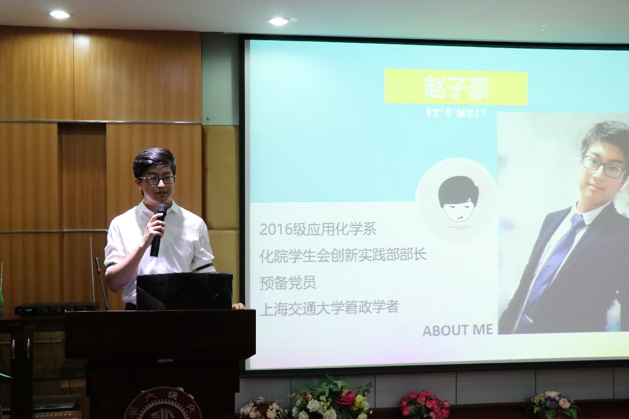 老师们介绍、分享之后,化院的三位学长学姐与同学们进行了经验分享。刘塞尔同学就自己大学三年的学习、科研、竞赛经验,向大家全方面的介绍了化院的学习生活。赵子豪同学就自己丰富的科研经历,为大家介绍了“莙政”、“大创”、“PRP”等科研项目,让大家充分了解了如何进入科研之门。在德国留学深造的郑彩妮同学通过视频,与大家分享了在化院的所思所得,也表达了对同学们的美好期望。