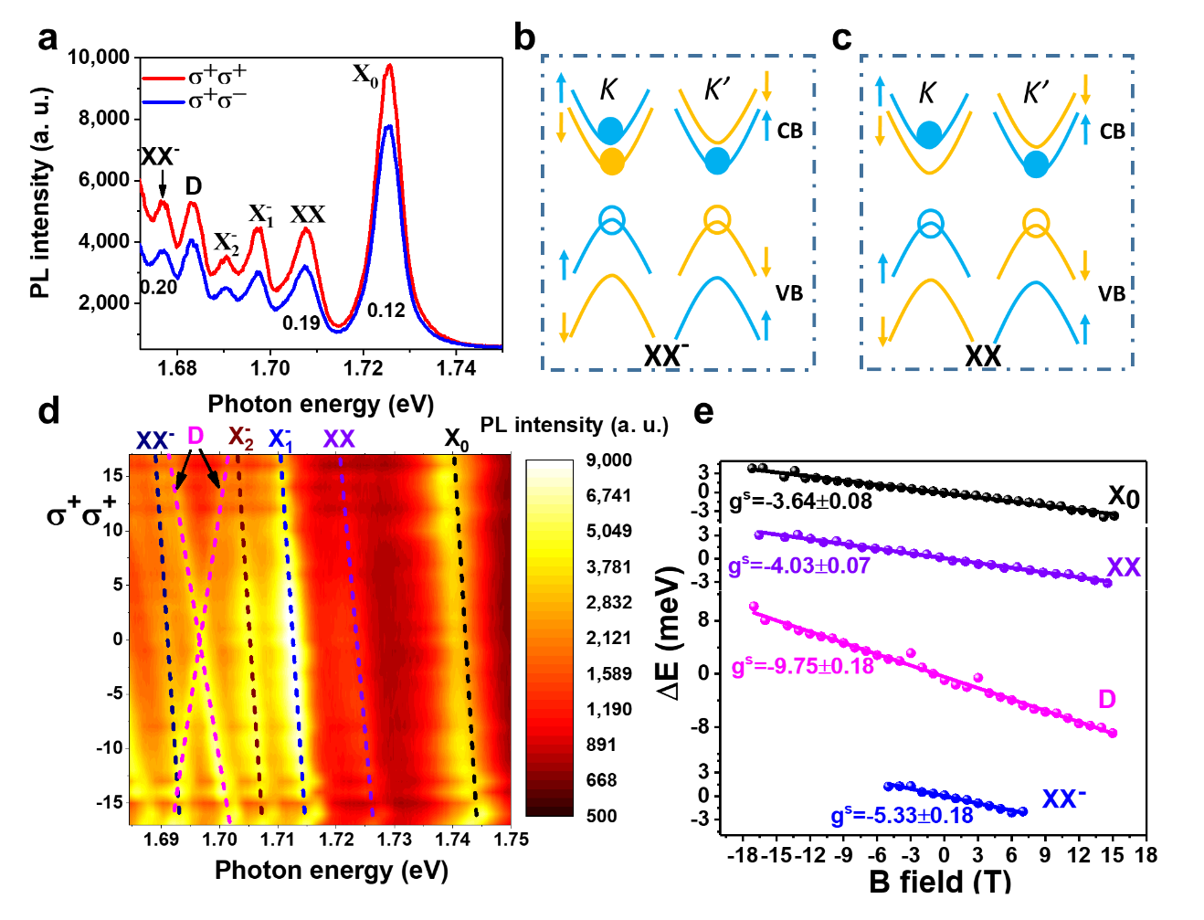 其次,通过改变激发光的圆偏特性观察PL的能谷极化(图2 (a)),发现双激子和带负电双激子的能谷极化率分别为0.19和0.20,比激子的0.12高。此外,通过PL随磁场的变化得到双激子和带负电双激子的g值分别为-4.03和-5.33 (图2(d)和2(e)),通过与理论值比较并结合能谷极化特性,确定双激子和带负电双激子的构型分别为图2(b)和图2(c)。