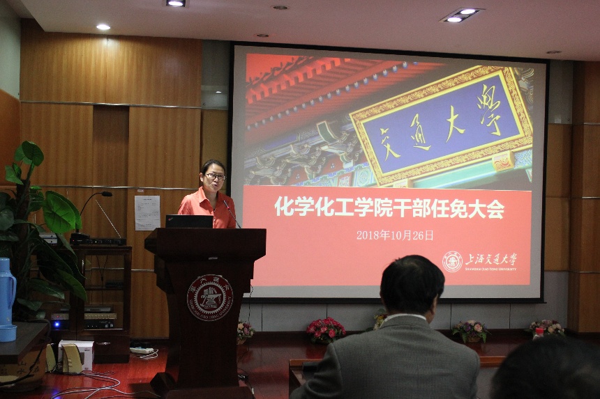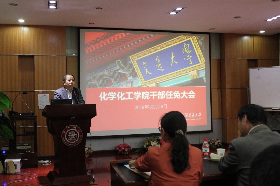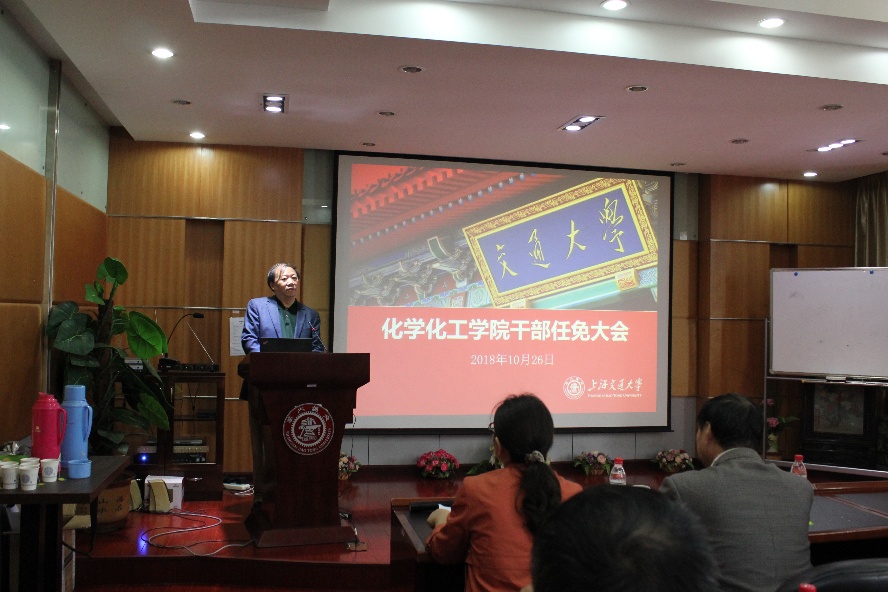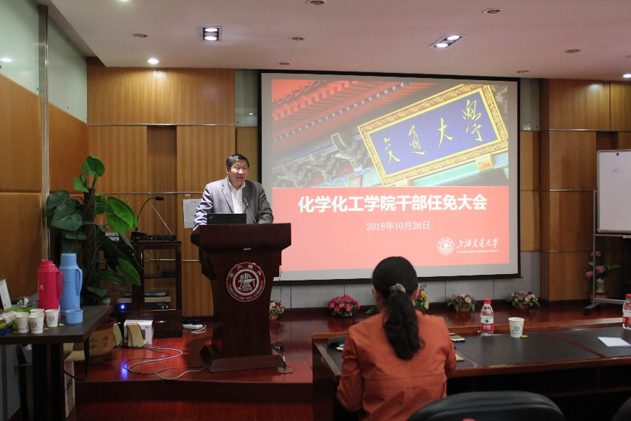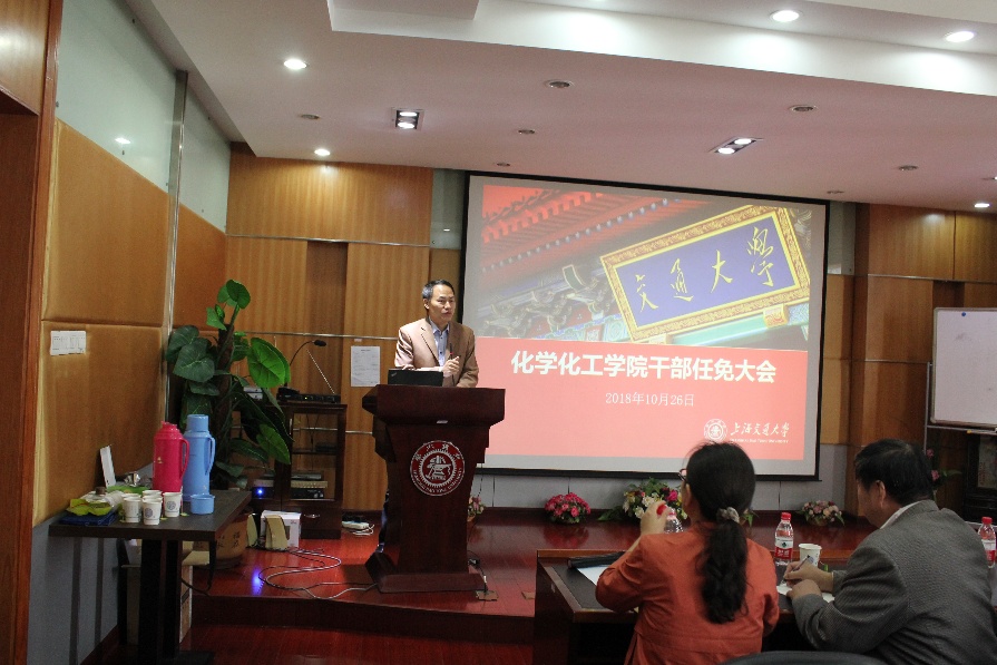 2018年10月26日上午,在学院528演讲厅召开学院干部任免大会。上海交通大学校长林忠钦,校党委组织部部长仰颐到会。仰颐宣布学校关于任命涂永强同志担任化学化工学院院长,任命周永丰同志担任化学化工学院副院长的决定。学院党政班子全体成员、党支部书记代表、教师代表及学院党政办公室人员等近100余人出席。会议由仰颐主持。