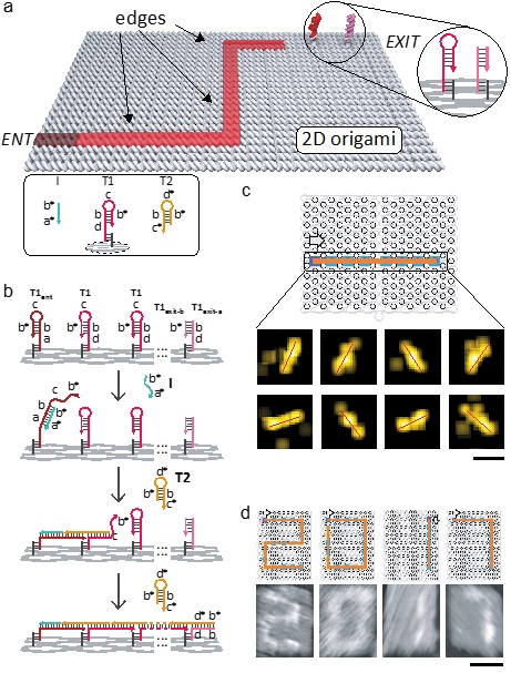 分子机器研究领域近年来得到了飞速发展,已经研制出利用光、电、化学能等来驱动的各种分子机器。然而,如何发挥分子机器的功能并实现一定的应用则存在很大困难。特别是常规的分子机器往往难以进行有序多级组装,这限制了利用分子机器构建特定功能器件或分子机器。DNA分子作为一种进化产生的遗传物质,具有卓越的碱基配对识别能力,可以实现精确的分子自组装,并且可以构筑出具有高空间分辨和定位能力的纳米结构。因而,DNA纳米结构已在纳米电子学、纳米光子学、单分子催化等研究领域中发挥了重要作用。上海交通大学化学化工学院樊春海教授与同济大学柳华杰教授(原上海应用物理研究所研究员)、慕尼黑工业大学教授Fritz Simmel等合作,通过将DNA杂交链式反应精确“锚定”到DNA纳米结构上,可以实现在纳米界面上沿着设计路径的分子级联反应。借助于原子力显微镜和超分辨显微镜等单分子成像技术,研究者可以清晰观察到DNA分子机器人的行走轨迹。该DNA分子机器人在引发信号链的作用下,可以在沿着预先设定的路径直线或转弯行走。
