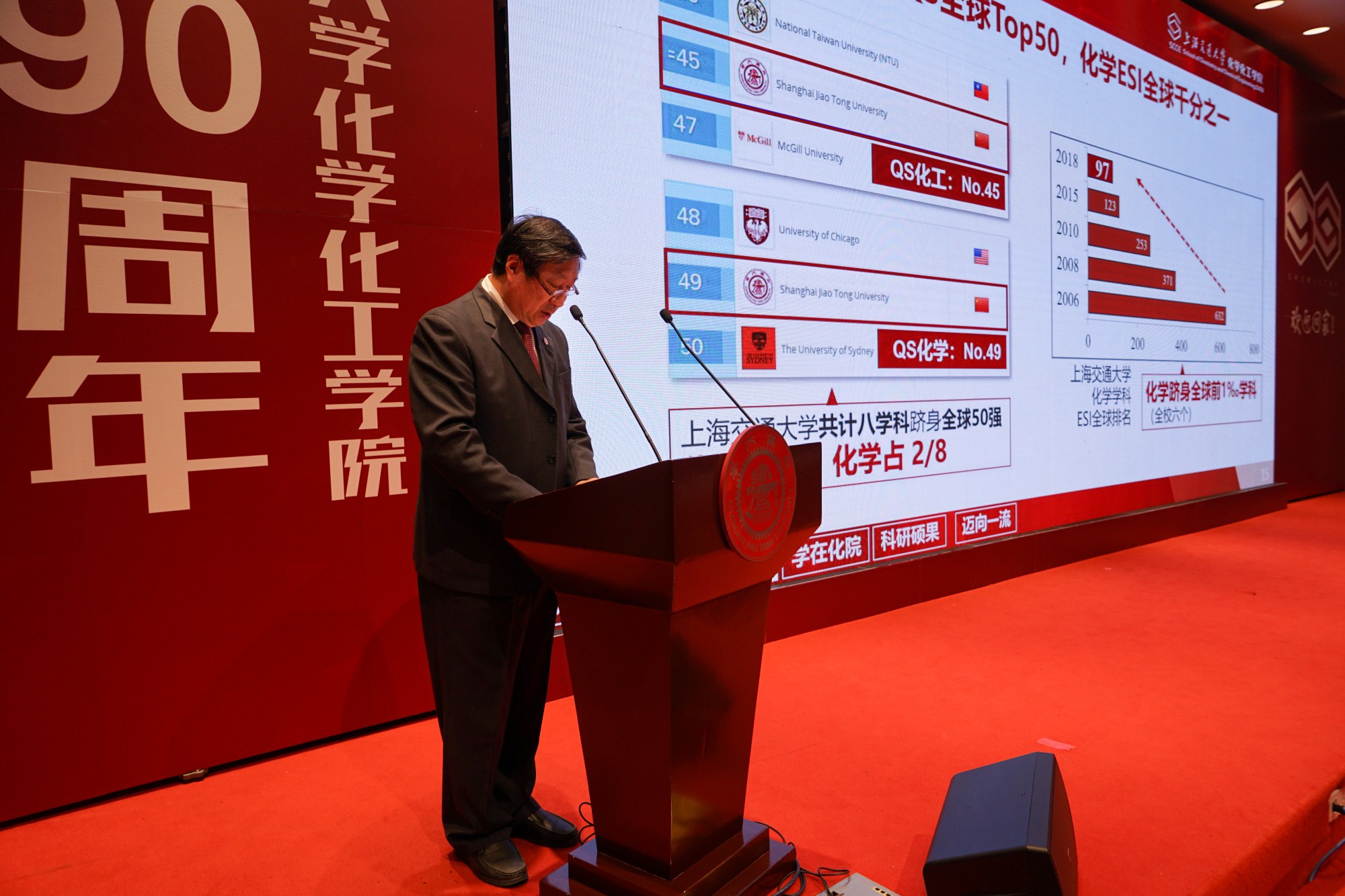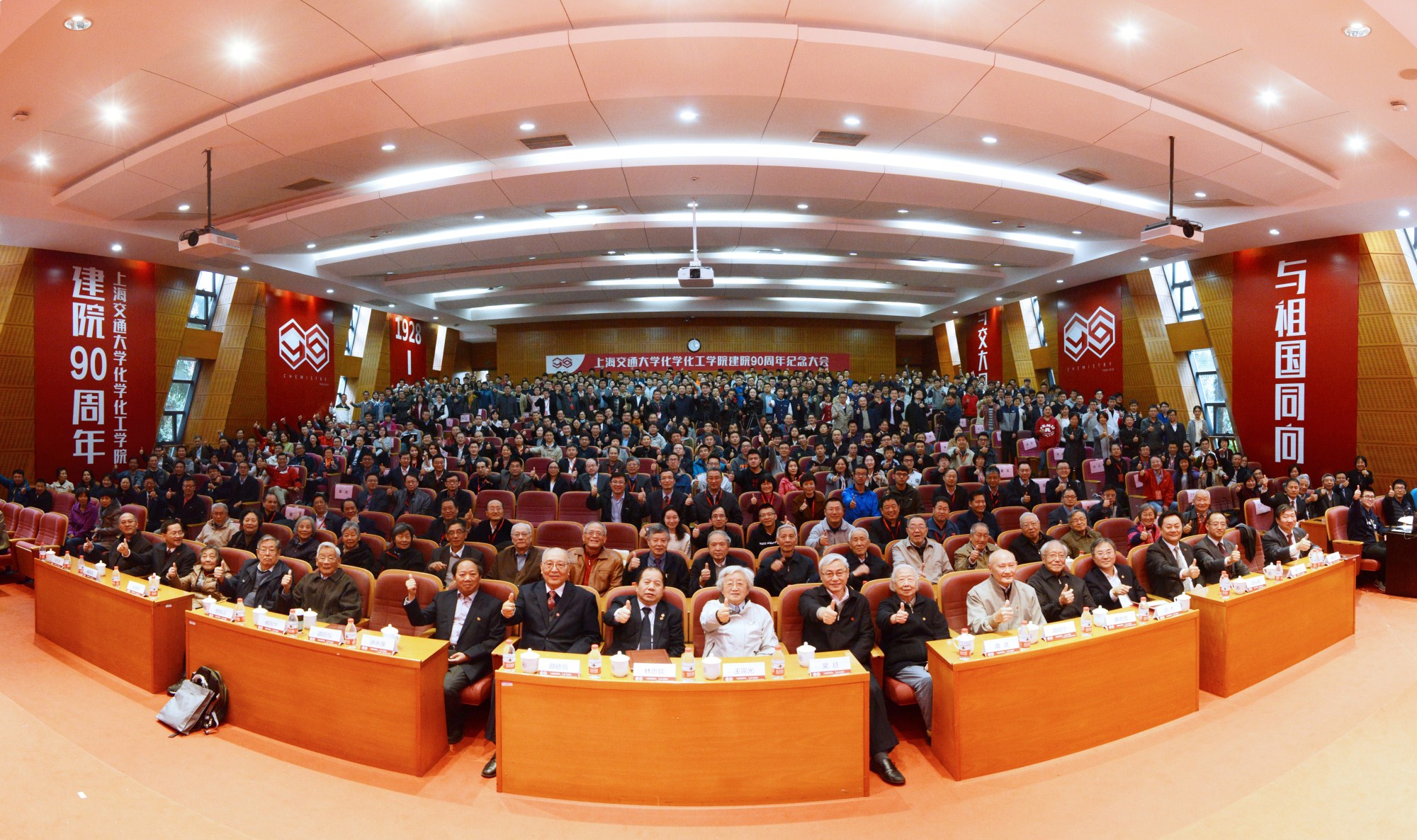 2018年11月18日上午,上海交通大学化学化工学院建院九十周年大会在陈瑞球楼100号报告厅举行。中国工程院院士、上海交通大学校长林忠钦,原上海交通大学党委书记王宗光,上海交通大学校务委员会专职副主任吴旦,中国科学技术大学副校长、化学与材料科学学院院长杨金龙,中国科学院院士颜德岳,中国科学院院士、上海交通大学化学化工学院院长涂永强,中国科学院院士、上海交通大学分子医学研究院院长谭蔚泓,化学化工学院党委书记贾金平,化学化工学院校友会会长印杰,校友会秘书长陆怡皓,1949级化工系杨国华学长、杨振汉学长、王维聪学长,1950级化学系高滋学长、陶增宁学长、1950级化工系黄德音学长以及北京大学、清华大学、复旦大学等院校代表,中科院化学所、英国皇家化学会等科研机构代表,校内的各兄弟院系及机关部处代表,校友代表,化学化工学院退休教师,现任教师,以及化学化工学院学生代表参加了此次大会。大会由化学化工学院副院长周永丰主持。大会在庄严的国歌声中拉开序幕。