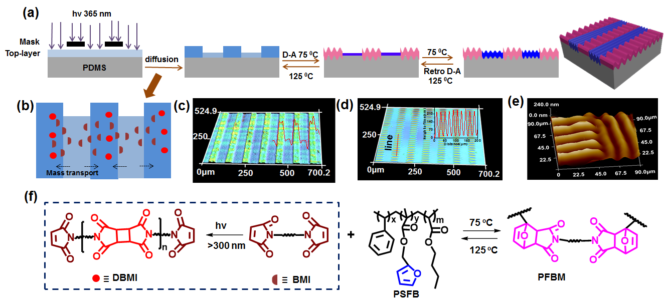 近日,材料领域知名期刊《Advanced Materials》在线发表了上海交通大学化学化工学院印杰-姜学松课题组在聚合物表面微纳米图案方面的最新研究进展“Hierarchical 3D patterns with dynamic wrinkles produced by a photocontrolled Diels–Alder reaction on the surface”。化学化工学院博士研究生李甜甜同学是该论文的第一作者,姜学松研究员是该工作的通讯作者。