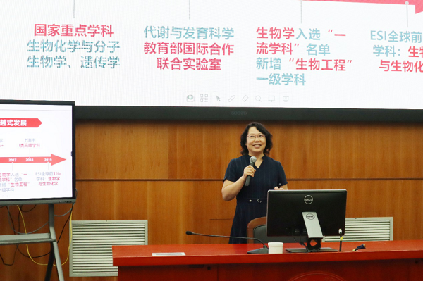 生命科学技术学院常务副院长冯雁介绍了生命科学技术学院坚持开展新学科建设,注重学术交流与国际合作,围绕“四位一体”理念,着力培养学术精英与行业领军人才,持续推进人才强院与基地建设,教学成果丰硕。