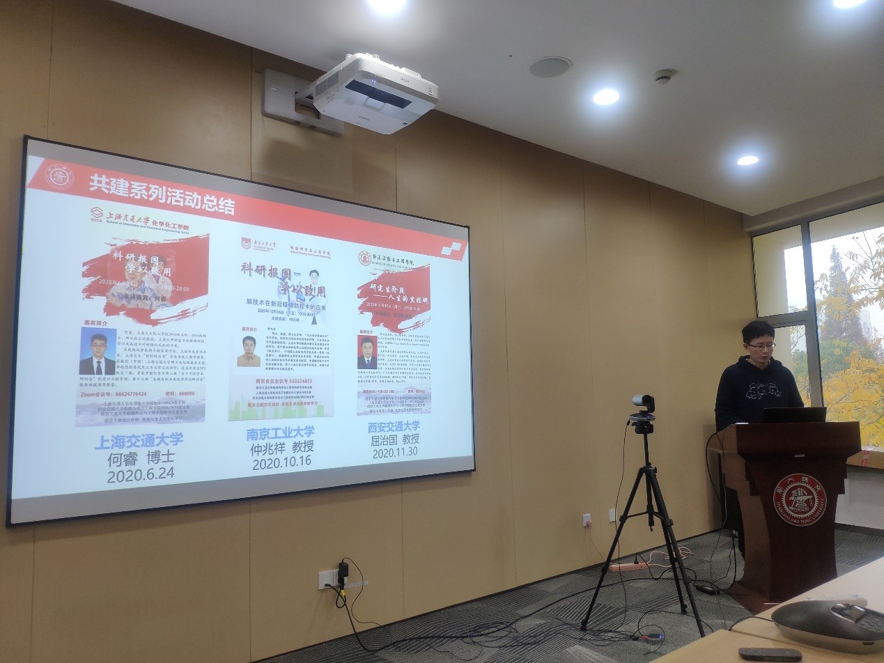 12月11日,上海交通大学化学化工学院B1911093/4党支部联合南京工业大学能源学院研究生党支部开展“科技报国,学以致用”主题党日活动。南京工业大学能源学院党委书记戴宏、化学化工学院特邀组织员朱建程、人文学院党建指导教师韩红蕊、化学化工学院党建指导教师梁晶出席,化院20级研究生新生党员参加,活动由B1911093/4支部书记任文主持。