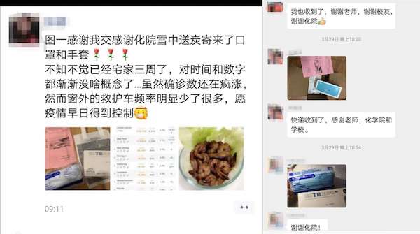 连日来,新冠肺炎疫情在全球范围扩散,交大化院校友会积极联络疫情防控重点地区校友,关注校友健康,并组织校友力量,为疫区校友提供支持。经校友会秘书处倡议,我们针对国内、外受疫情影响较大且需要帮助的校友进行需求收集并进行帮助,防疫物资为一次性口罩和手套。截止5月份,帮扶湖北及国外化院校友、及其化院交换生70人。此次活动受到校友的一致好评。